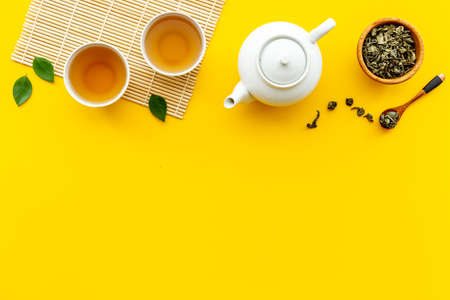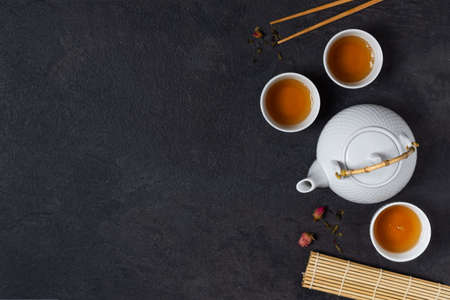 Tea ceremony with teapot and tea cups top view with copy space. Asian tea ceremony.