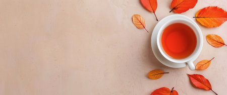 A serene setting featuring a cup of warm tea surrounded by autumn leaves and berries, creating a cozy atmosphere perfect for enjoying a moment of tranquility in the fall.