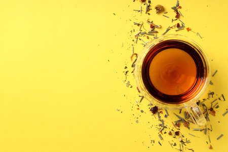 A cup of black tea in a ceramic yellow cup with dry tea scattered on a yellow background. Copy space.