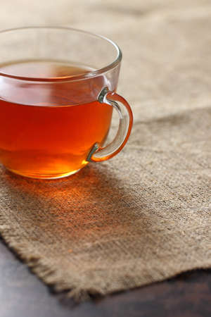 Tea in a glass transparent mug on burlap tablecloth.