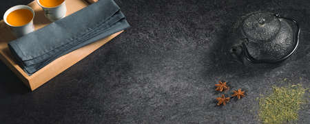 High angle shot of a still life with vintage black metal Japanese tea pot on a dark stone table. Free copy space for caption. Tea ceremony concept. Hot beverage preparation. Green tea and anise star.