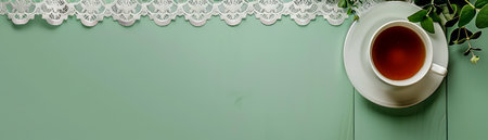 Serene Tea Time Elegant Cup of Tea on Pastel Green Background with Delicate White Lace and Fresh Leaves AI Generative