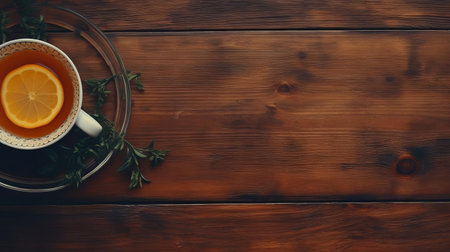 Top view of a cup of tea placed on a rustic wooden table, creating a cozy atmosphere.