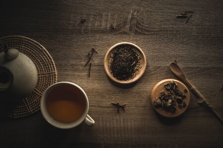 Tea cap on the wooden table with jar of tea