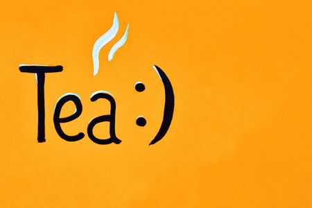 Calligraphic inscription Tea made in black paint on an orange wooden background. copy space. restaurant, cafe