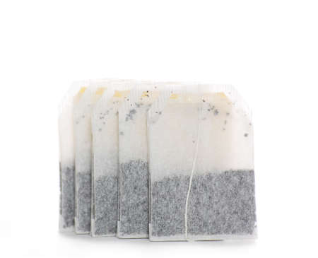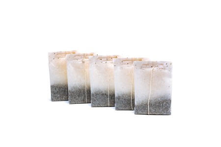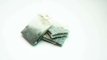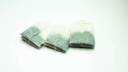 Tea packaged. Several packages of tea on a white background close-up, in front of it is scattered small tea with a package. Isolate