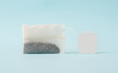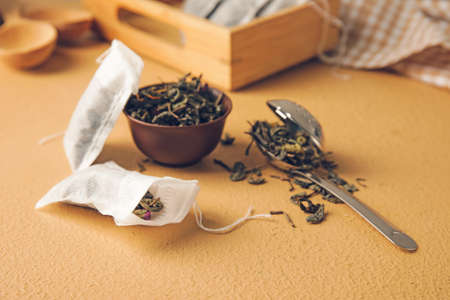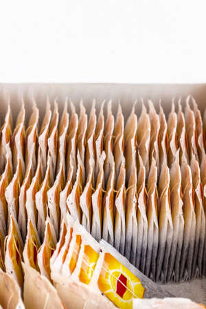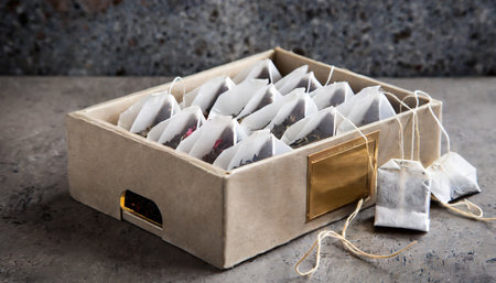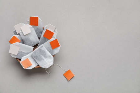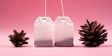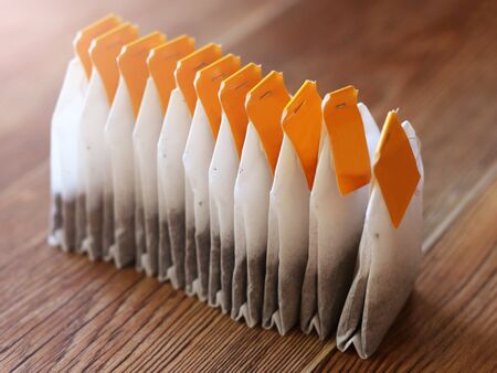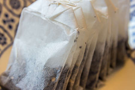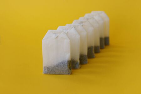 Teabag close-up in tea packaging. Tea bags in a package. Tea box. Breakfast. Food concept.