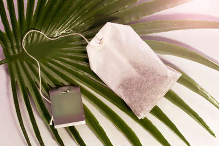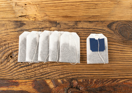 New Tea Bag with Blank Tag on Wood Table. Teabag Mockup, Tea Bag with Paper Label on Wooden Background Top View, Copy Space