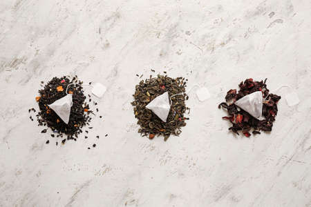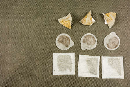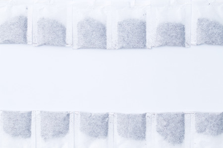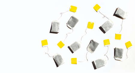 Group of square dry tea bags on a white background. Top view. Copy, empty space for text.