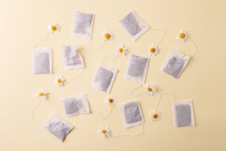 Herbal alternative medicine series: Chamomile flowers and teabags on yellow background. Seasonal anti-depression, stomach and colds remedy treatment