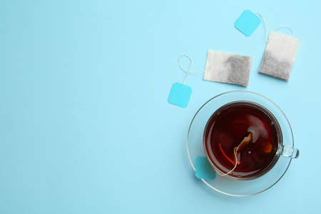 Tea bags and glass cup of hot drink on light blue background, flat lay. Space for text