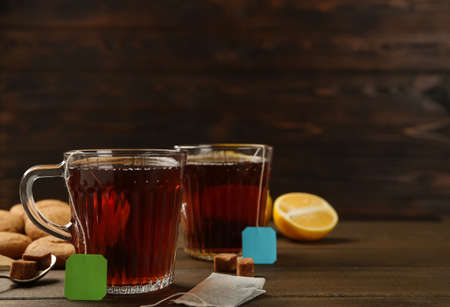 Chinese hot black tea with ceramic mugs with tea bag on a wooden table