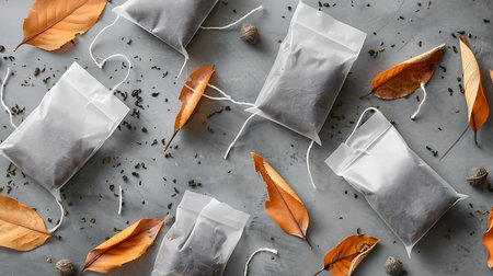 Delicate herbal textures of a biodegradable tea bag are captured in striking macro detail, illuminated by warm studio lighting against a clean backdrop, embodying a fresh, eco-friendly vibe.