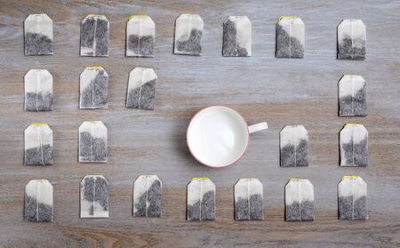 A large number of tea bags are laid out in even rows on a wooden vintage table. In the center is an empty tea cup. View from above
