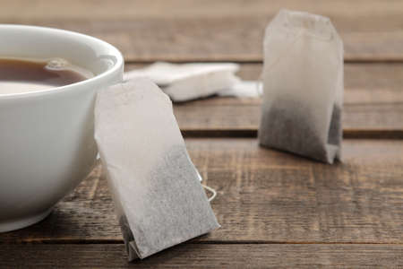 Cup with tea and tea bags on a brown wooden table. to make tea