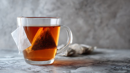 Golden amber tea steeping in a clear glass mug with a triangular tea bag. Elegant simplicity on a textured surface, perfect for a serene and comforting moment.