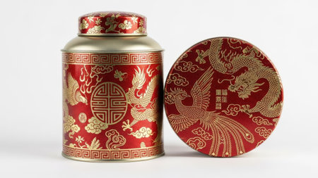 The image features a beautifully designed oriental tea canister with intricate golden patterns on a red background. The canister has a lid adorned with similar decorative motifs. The entire image is set on a transparent background, making it ideal for various design applications.