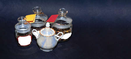 Top shot of dry tea filled in glass jars and copy space