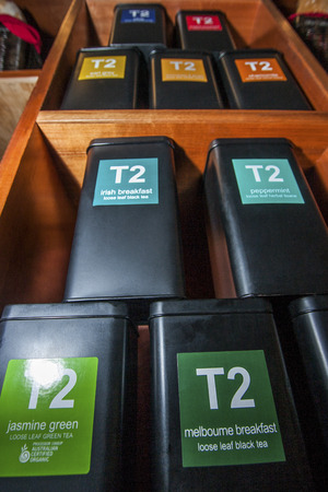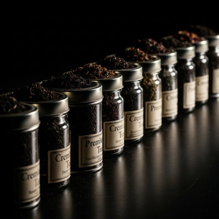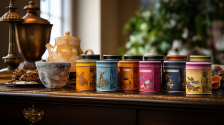 A row of ornate tins filled with exotic blends of carefully cultivated organic tea leaves