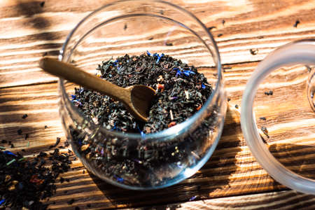 Black leaf tea with additives and a wooden spoon on the board