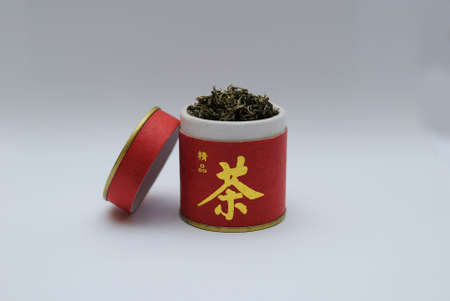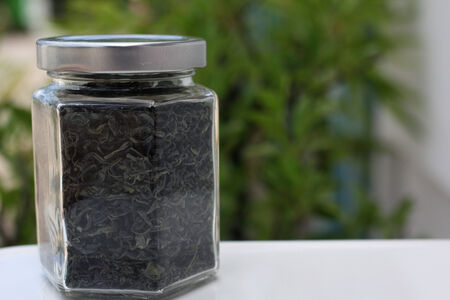 A jar of tea and green tea leaves