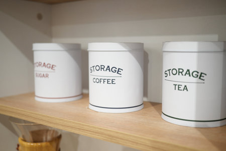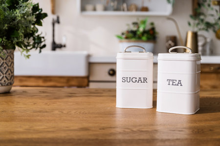 selective focus on white metal storage food containers with vintage design on wooden dining table on blurred kitchen background. closeup of sugar and tea canisters set on tabletop.