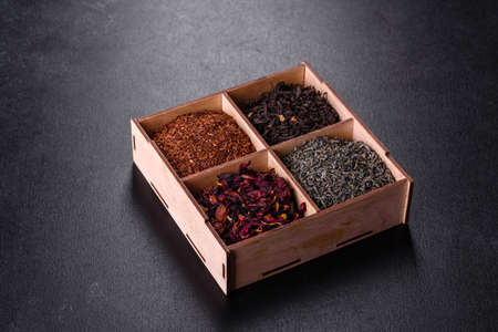 Different types of green, black and herbal tea in a wooden bowl. Variety of dry leaves and flowers. Organic high-quality ingredients for a drink