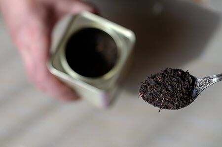 Vintage metal spoon of dry tea leaves. A can for storing tea leaves in the background. Making a traditional hot drink. View from above. Selective focus.
