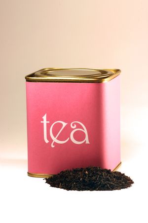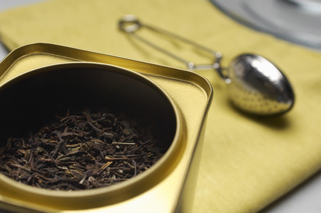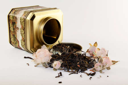 Dried tea leaves sprinkled from a can. An open metal can lies on a light background. Defocused shot. Eye level shooting. Specially reduced sharpness
