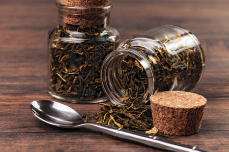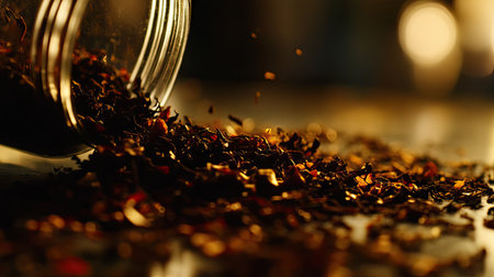 Detailed view of dry black tea leaves spilling from a glass jar onto a table, capturing the fine, curled texture and rich color.