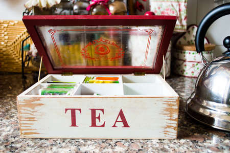 Recycled tea bags on a tea caddy