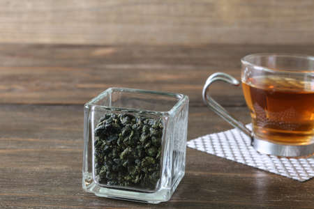 A cup of oolong tea and tea leaf on a wooden table.