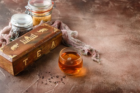 Glass cup of hot tea with jars of different kinds of tea - black, green, herbal and wooden box for tea