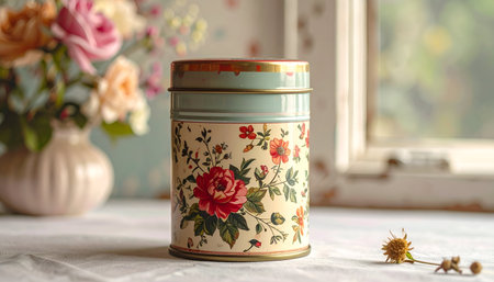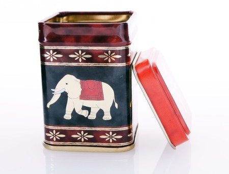 Editorial close-up of a vintage metal tea tin, featuring strong backlighting to create a dramatic si