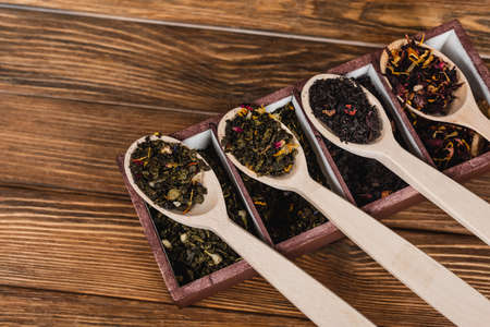Different kind of Dry tea - green, black, mint, rose and chamomile, wooden spoon in the box
