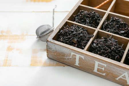 Dry black tea leaves in box and infuser on light background