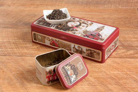 Bologna - Italy - December 17, 2021: The London Tea Company metal box isolated on wooden background