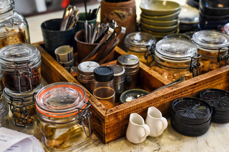 Interior of coffee shop. Glass jars with tea bags on shelves. Toned with retro vintage film effect filters.