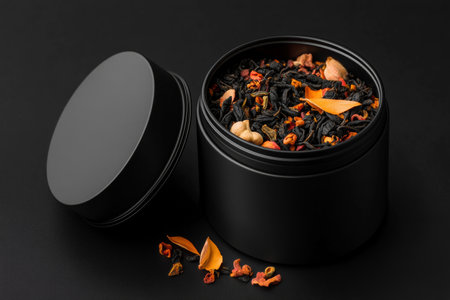 A sleek black tin showcases a luxurious black tea blend, filled with colorful spices and petals. The dramatic lighting enhances the elegant branding, inviting a moment of indulgence.