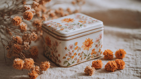 Vintage gift box with dried flowers on a white background. Selective focus.
