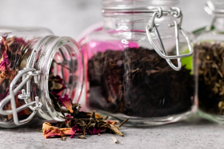 Front close up shot of glass jars filled with dry tea and defocused tea in the foreground