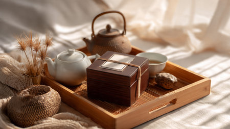 Tea set in wooden tray on bed, closeup. Morning atmosphere