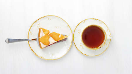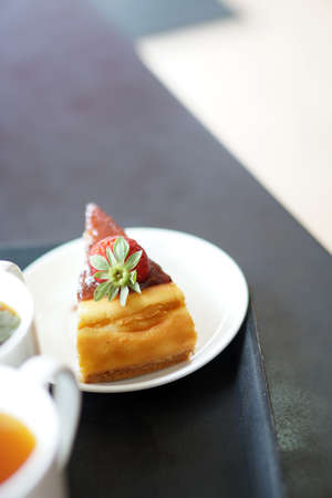 Slice of cheese Cake with cream and fresh strawberries on plate with a cup of tea over blur background. Tea time concept Selective focus