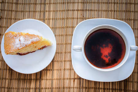 Plum sponge cake over a cup of hot tea on a straw bedding.