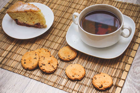 Plum biscuit cake for a cup of hot tea on a straw bedding with chocolate biscuits in a basket.