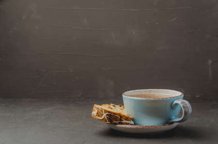 tea cup and pastries piece on dark stone table. Copyspace for your text