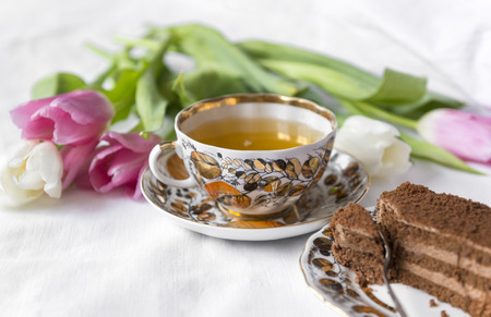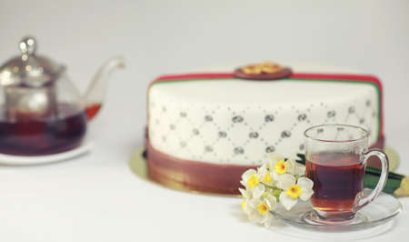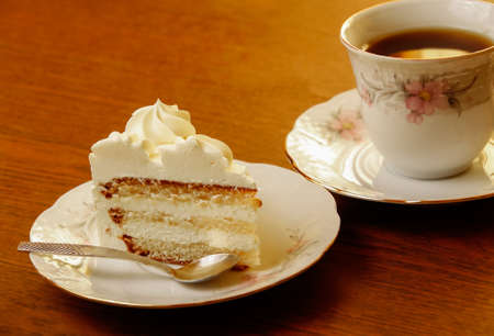 Still life with cake and cup of black tea. Strawberry layer cake close up photo. Beautiful retro styled tableware on a table. Birthday celebration photo.