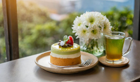 On a wooden table white plate with a nice cake and patterned glass cup with leaf herbal green tea
