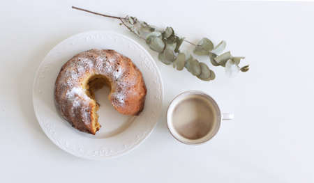 Close up of delicious homemade bundt cake dessert and fresh coffee on a white table background with a twig of eucalyptus.Top view. Food concept.