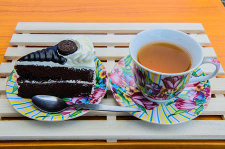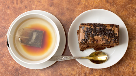 Chocolate mousse cake with lemon and cup of tea on wooden table